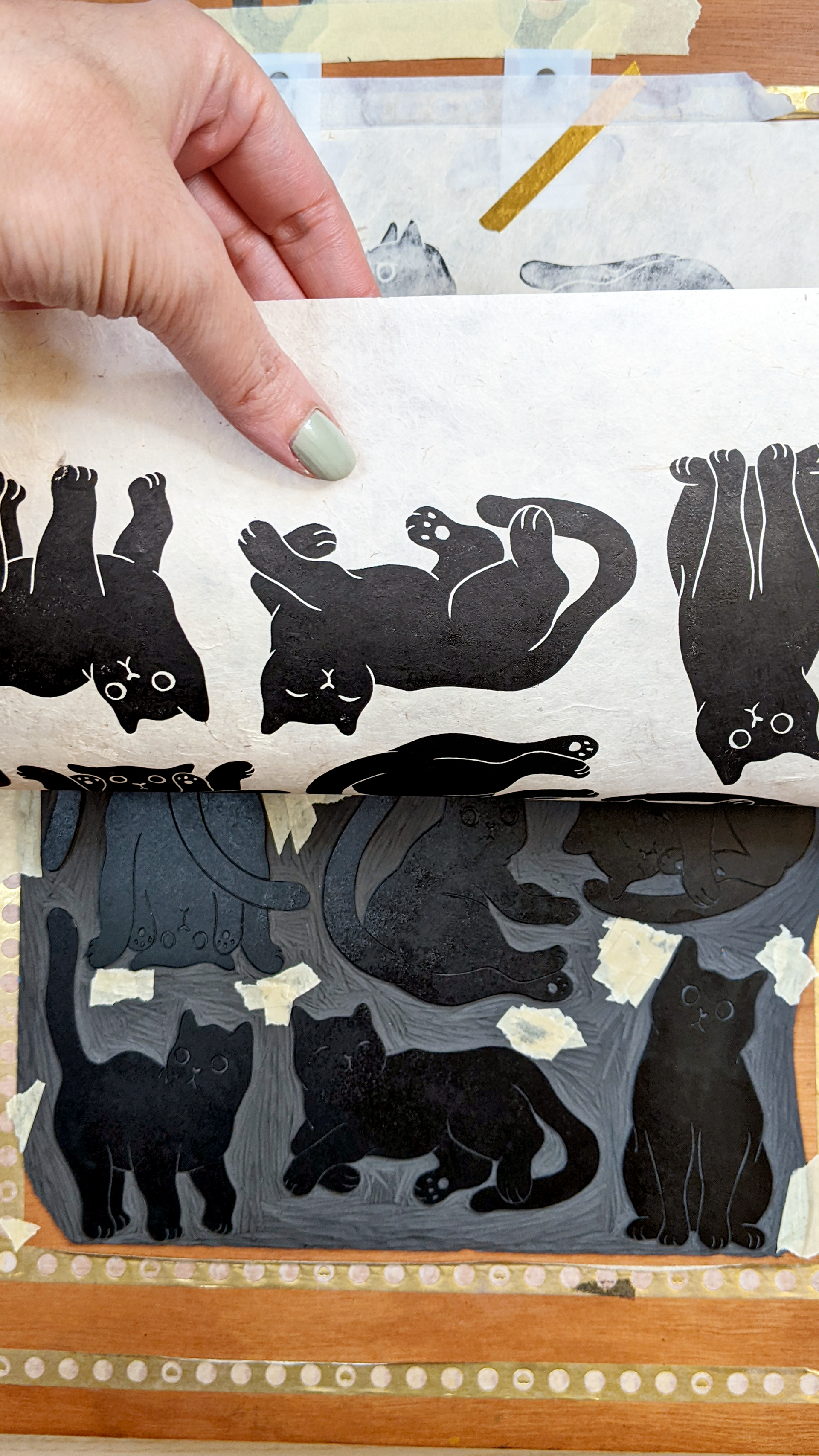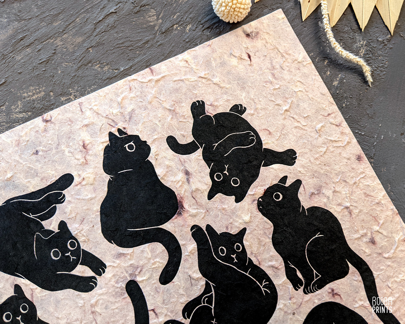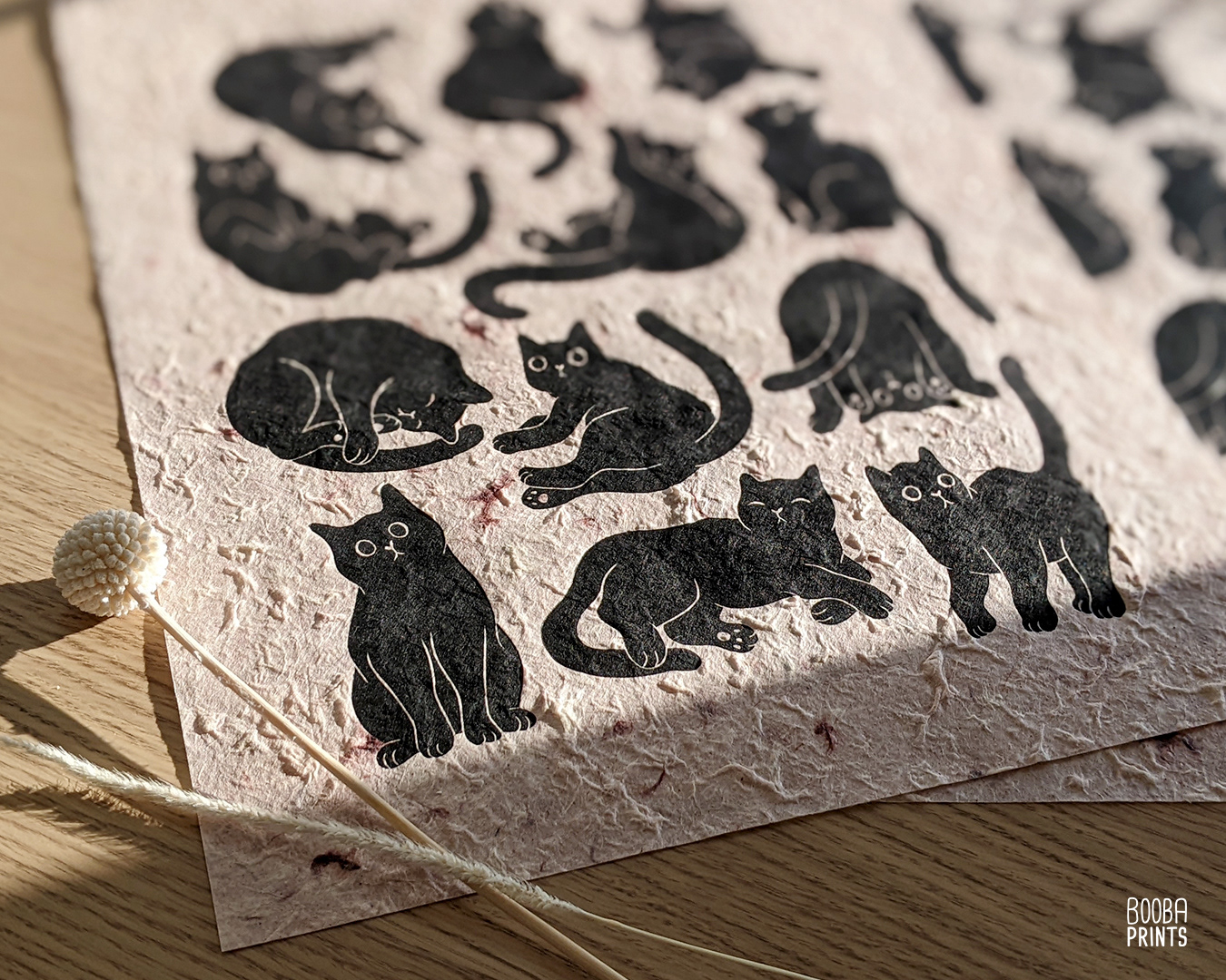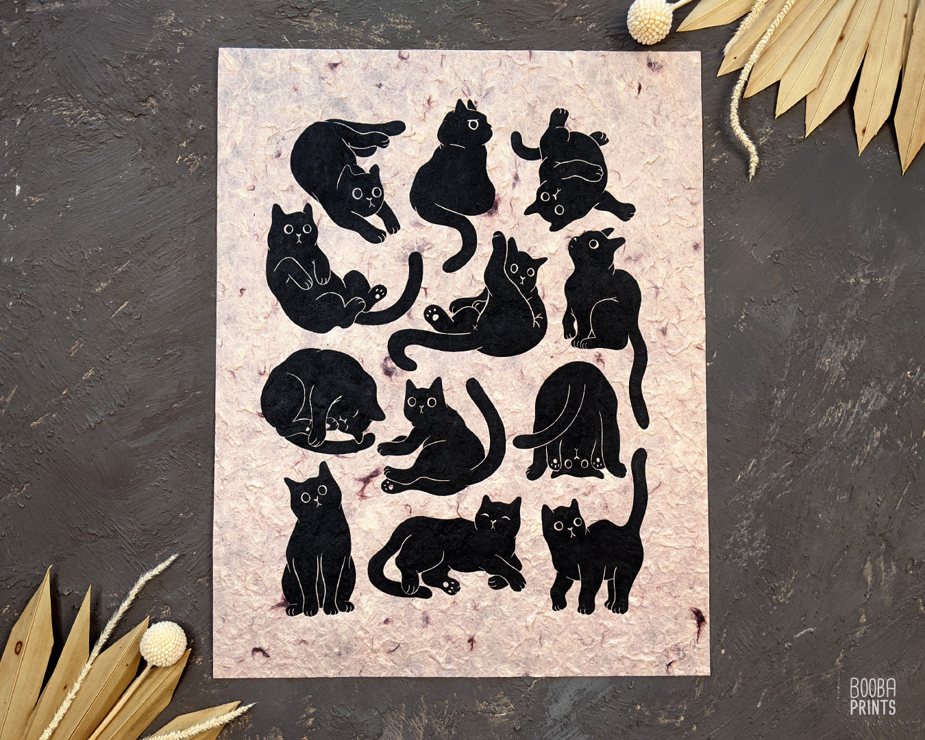 Hand carved from a linoleum block, hand printed by hand, this is my 12 Cats pieces, showing 12 different cats in 12 different poses and gestures