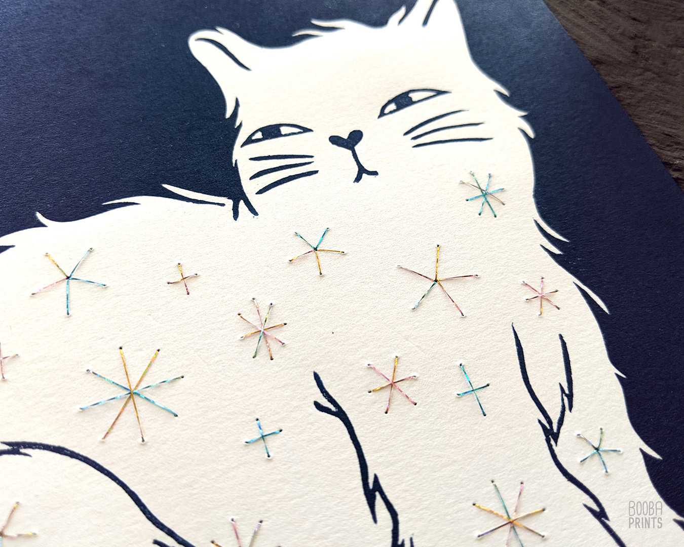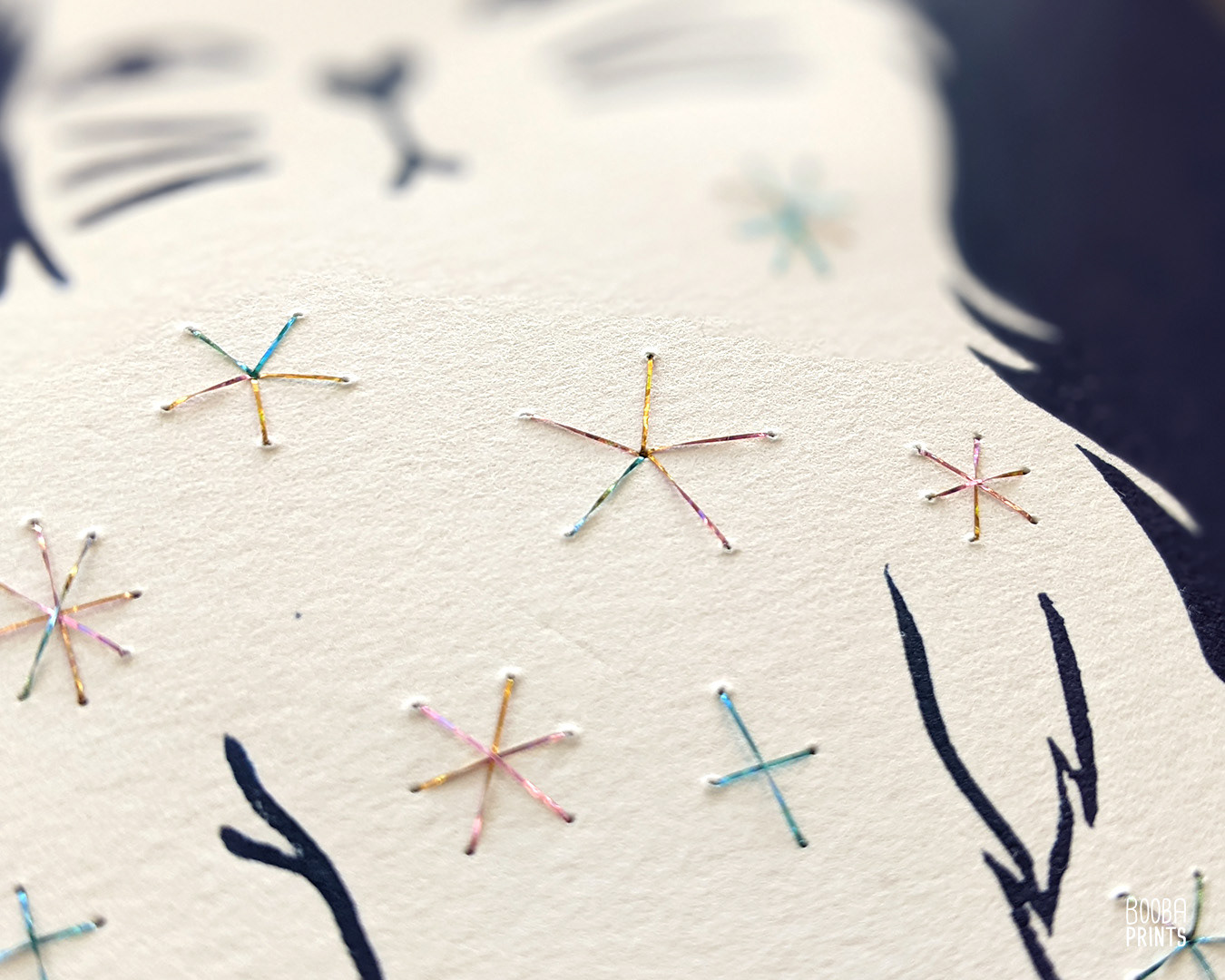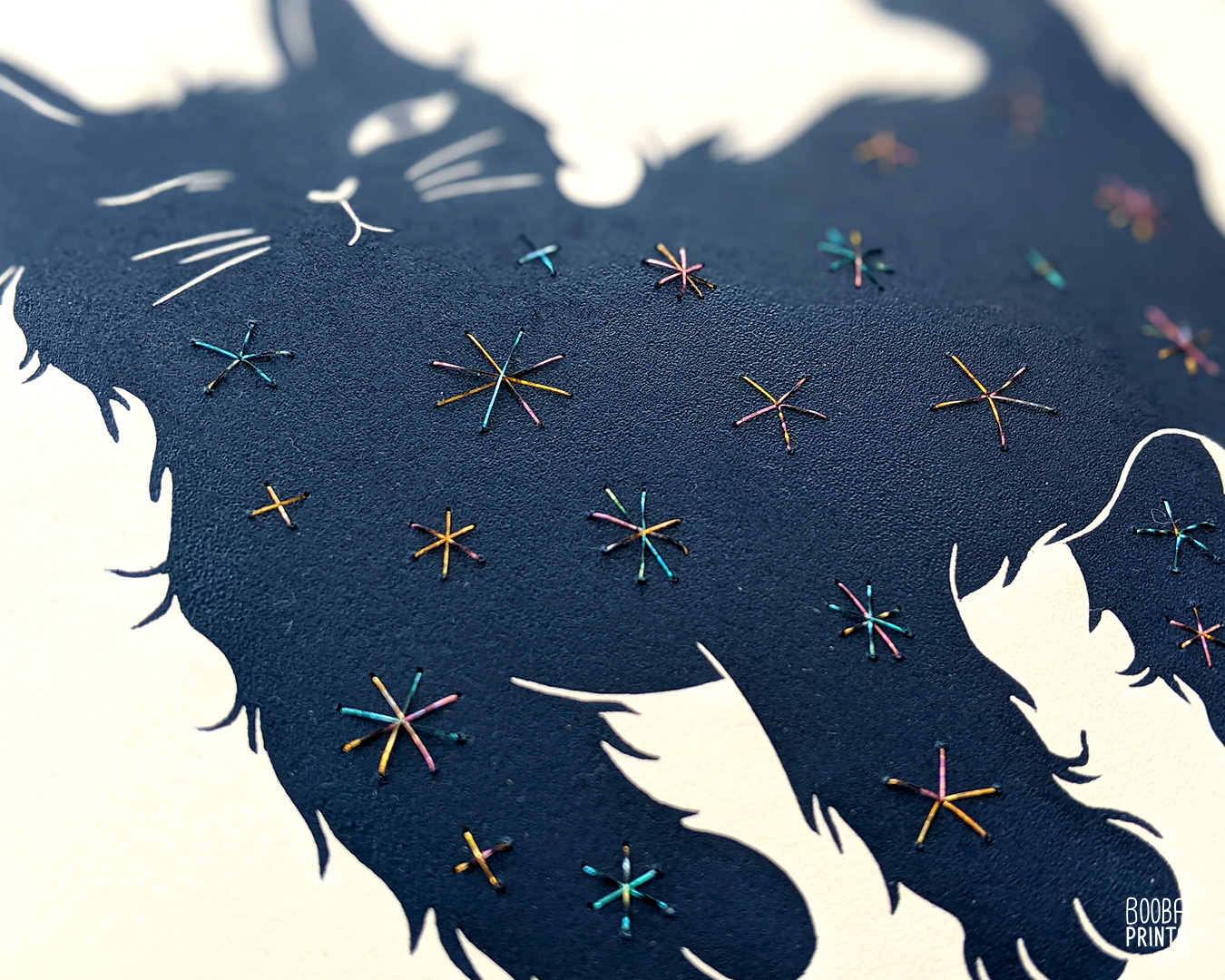 Day and Night Cats, are a duo of handmade linocut prints, which were hand embroidered on top. This set features 2 opposite cats, expressing the idea of duality and contrast.