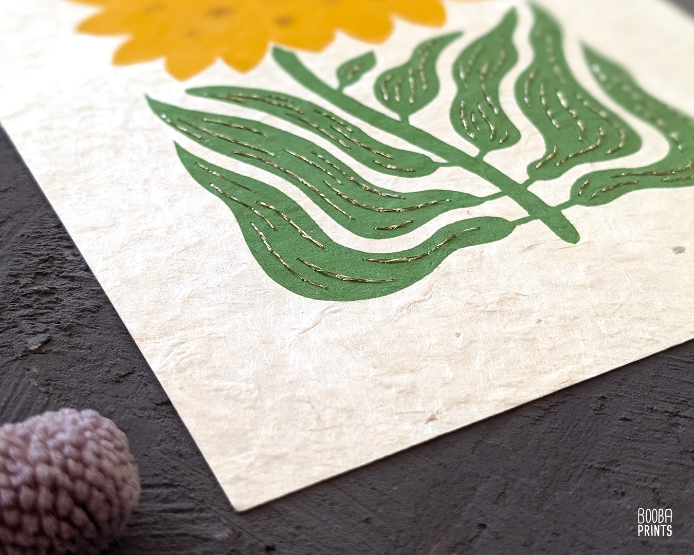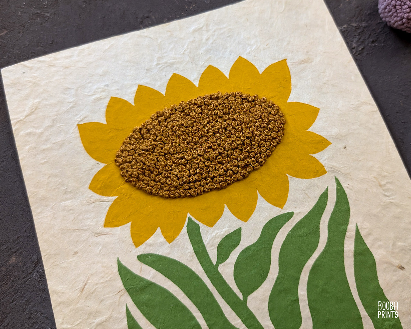 Sunshine Flower is a combination between my love of printmaking and my love of embroidery. I created this print after carving a linoleum block, rolling the ink, and printing it by hand. Then created 2 version of embroidered prints.