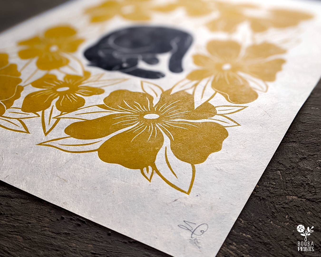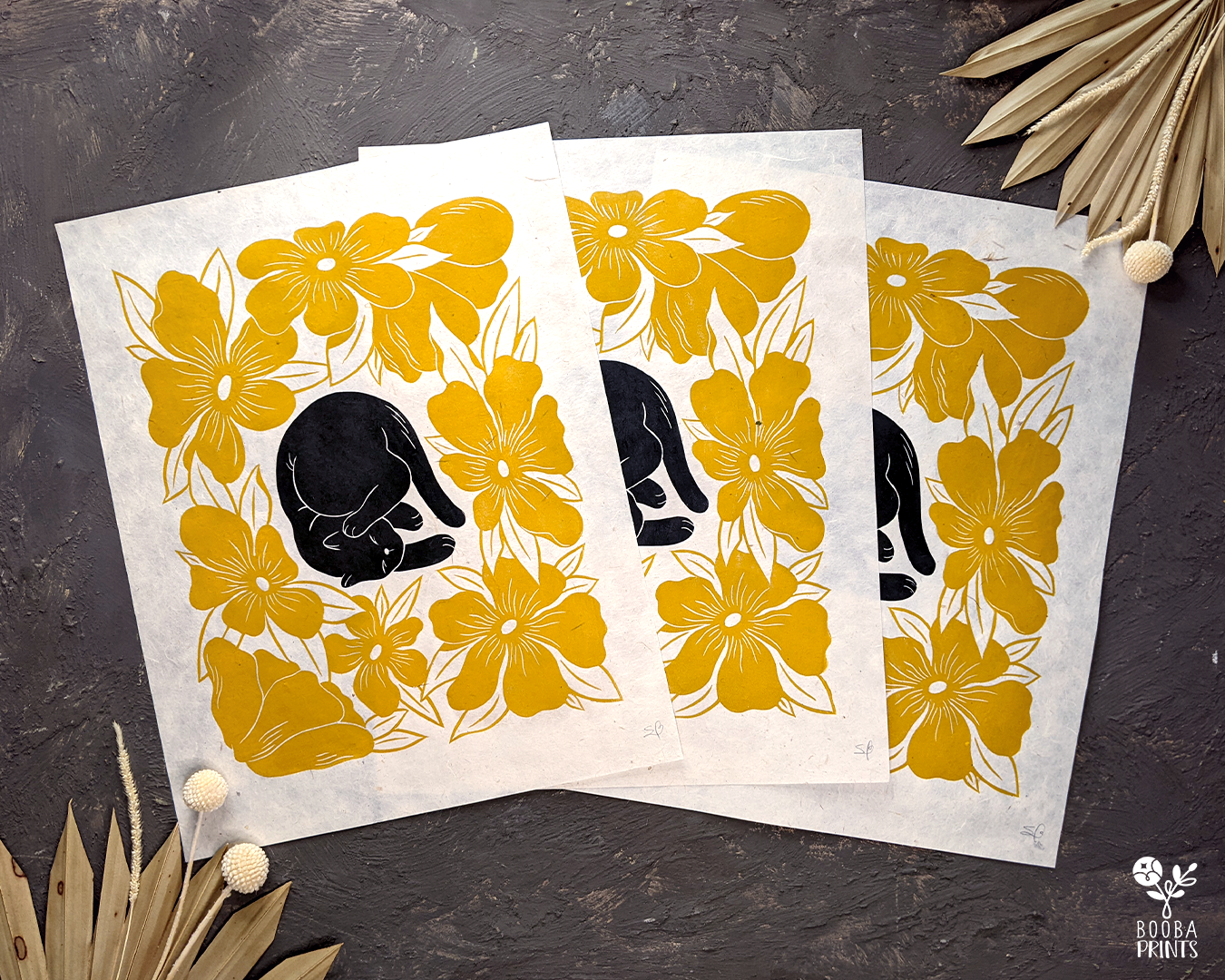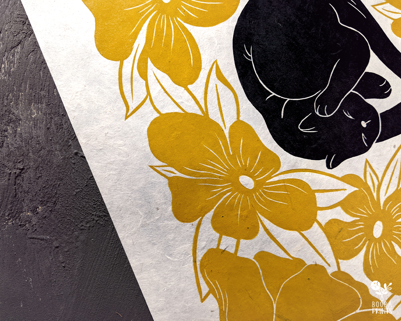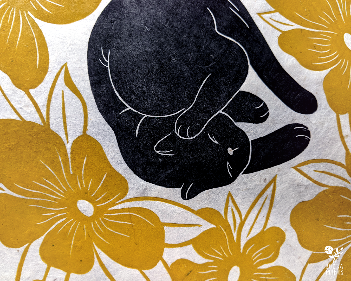 Lazy Cat was my first print in my "Cats & Plants Series", and the greater "Animals & Plants" series. This print combines my love for cats with my love of flowers and botanical. It's a handmade linocut print, carved from a linoleum block, then printed by hand using a wooden spoon with a printing press, creating the image by applying pressure on the paper.