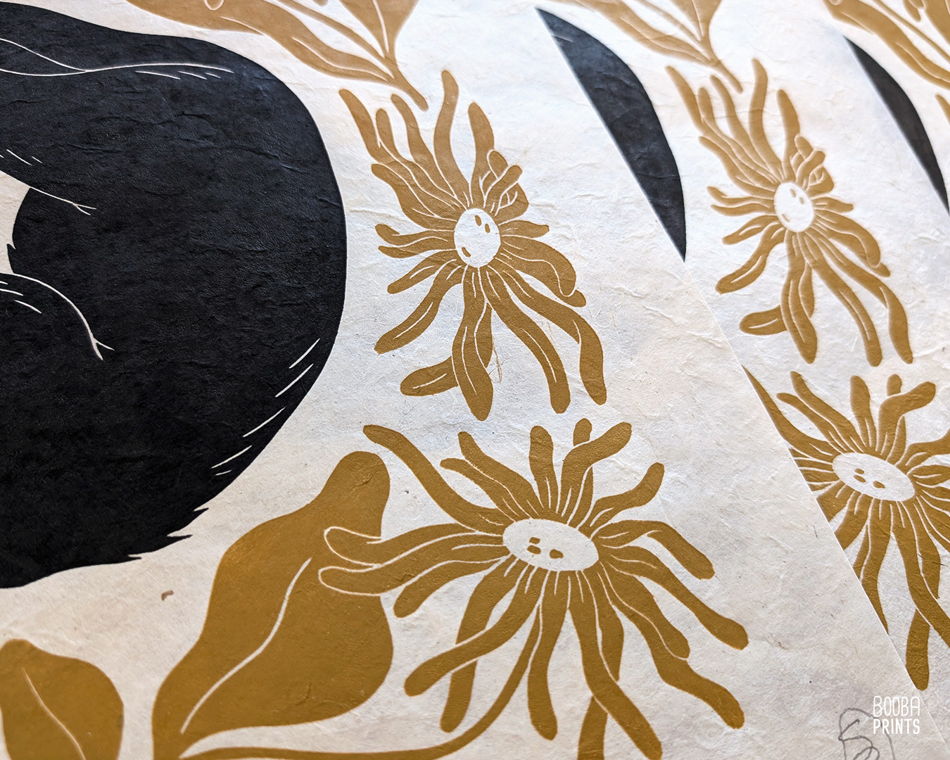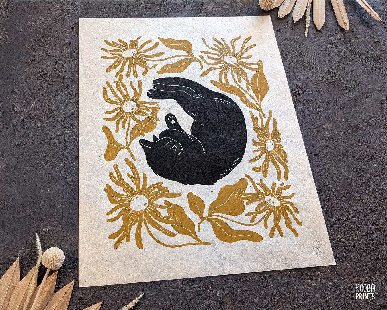 Shy Cat is the 6th addition to my Cats & Plants series, as well as part of my Animals & Plants series. It's inspired by my cat who loves covering his face when sleeping, making him look shy. This is an original handmade linocut print, carved carefully from a linoleum block, and printed by hand using a printing press and a wooden spoon, creating the image by applying pressure to the printmaking paper.