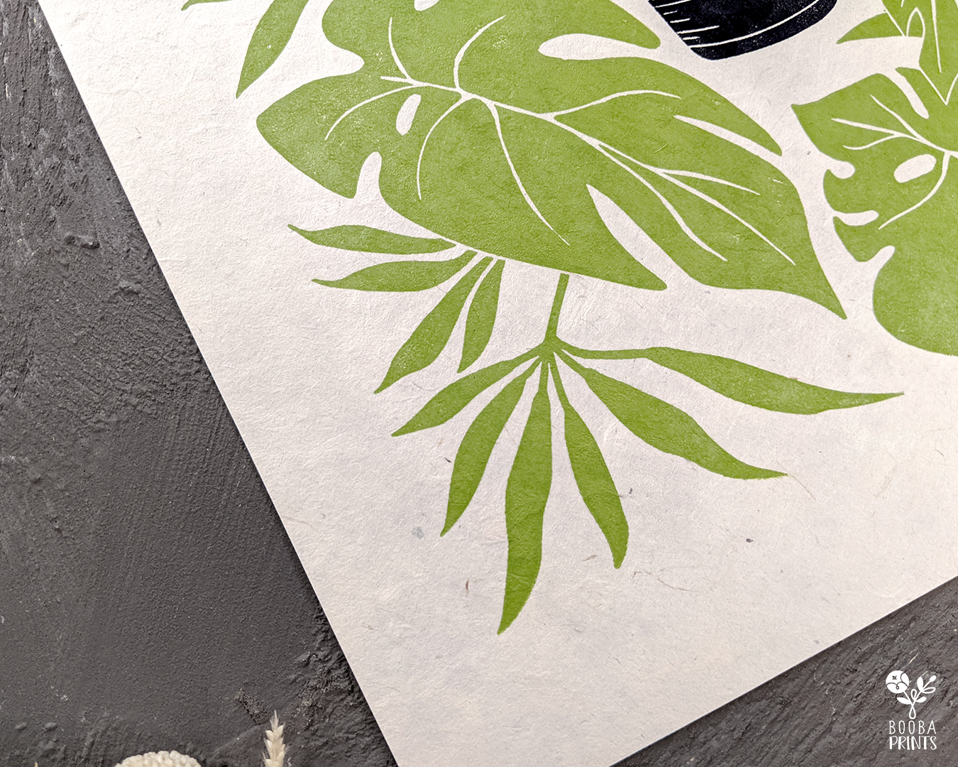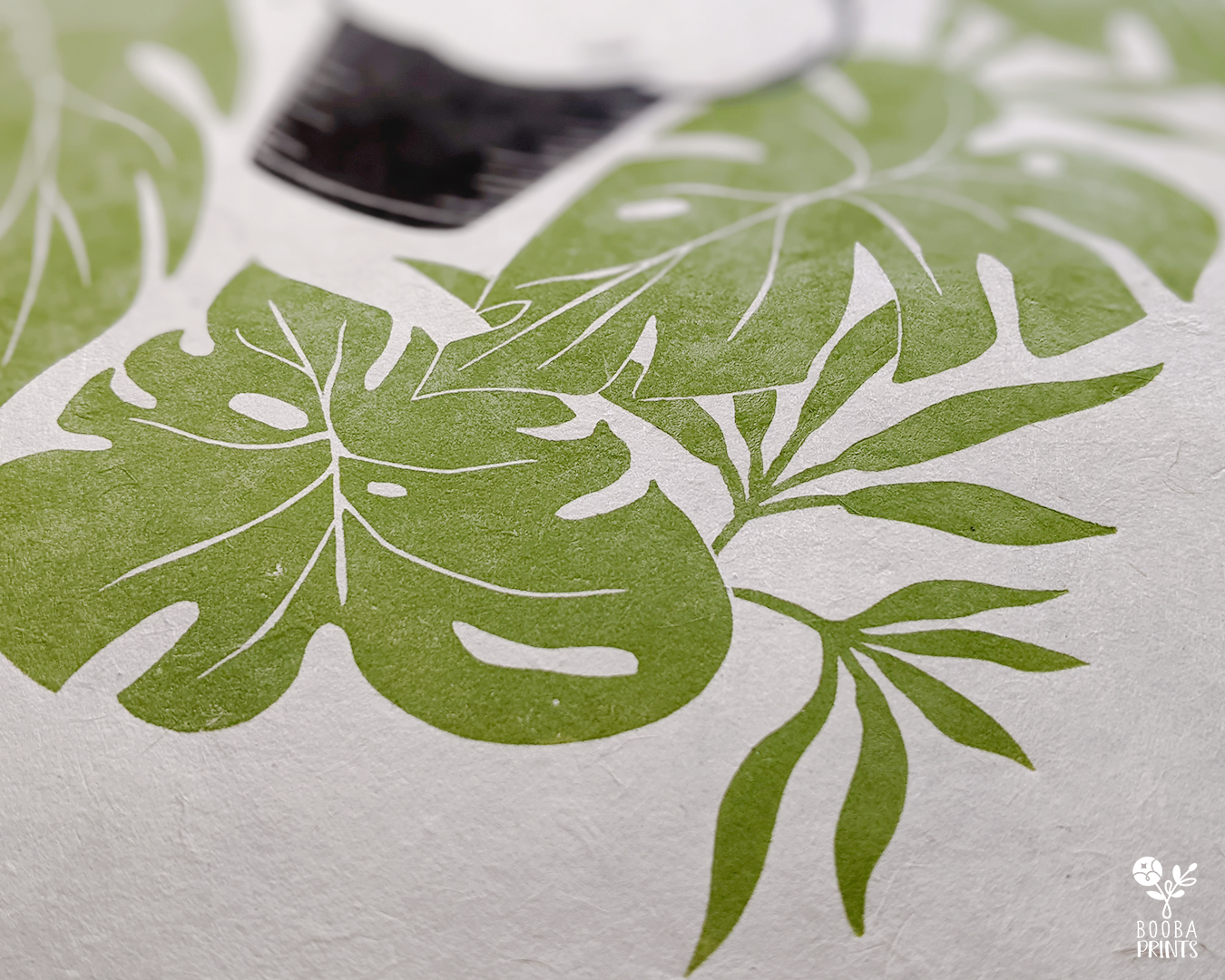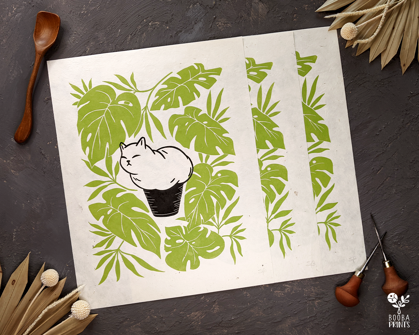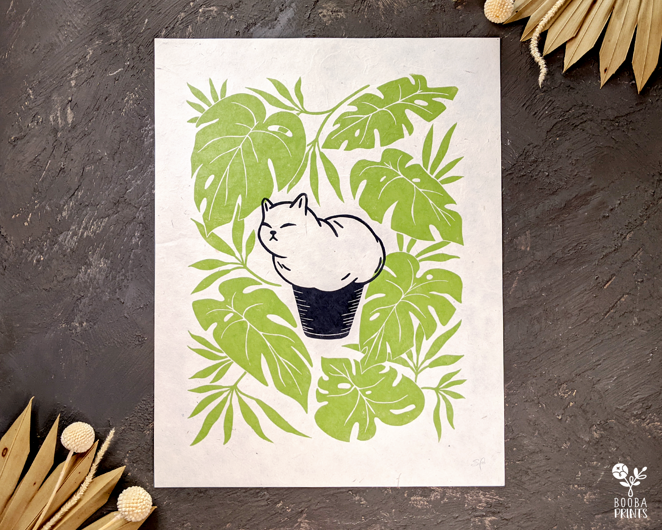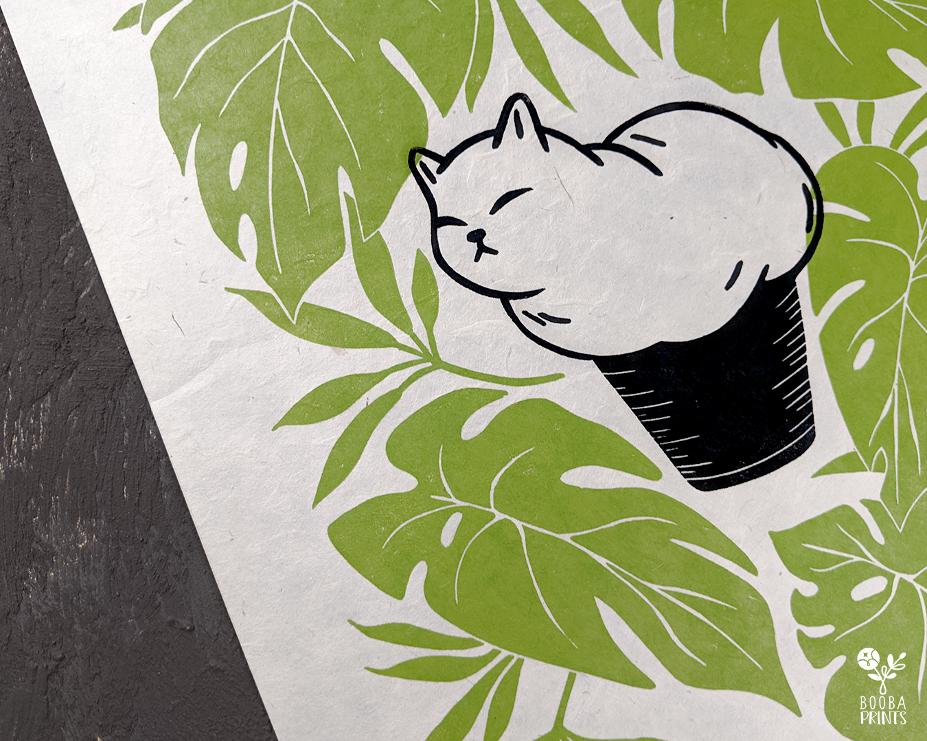Muffin Cat is my 2nd print in the Cats and Plants series, and Animals and Plants series. It's a cuttle little white cat, sitting and shaped like a muffin, surrounded by Monstera Deliciosa plant leaves. This print was carved by h and from a linoleum block, then printed with love on a printmaking paper, using a wooden spoon to create pressure.