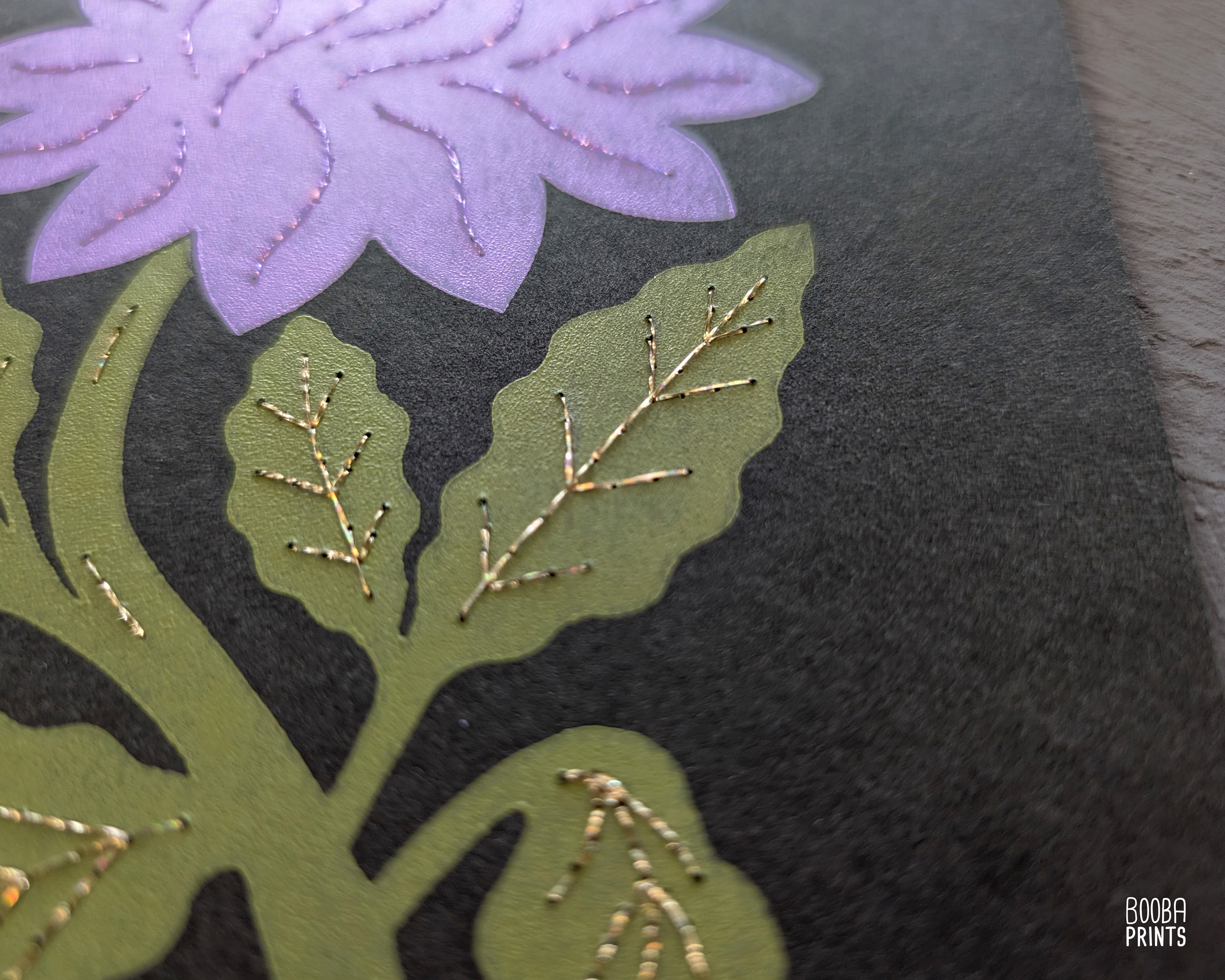 "Diamond Flower" is a minimalist stylized linocut print of a flower in purple and green, and hand embroidered on top with shimmery thread. I enjoy creating such a contrast between the modern stylized design and the traditional technique of printmaking and embroidery.
