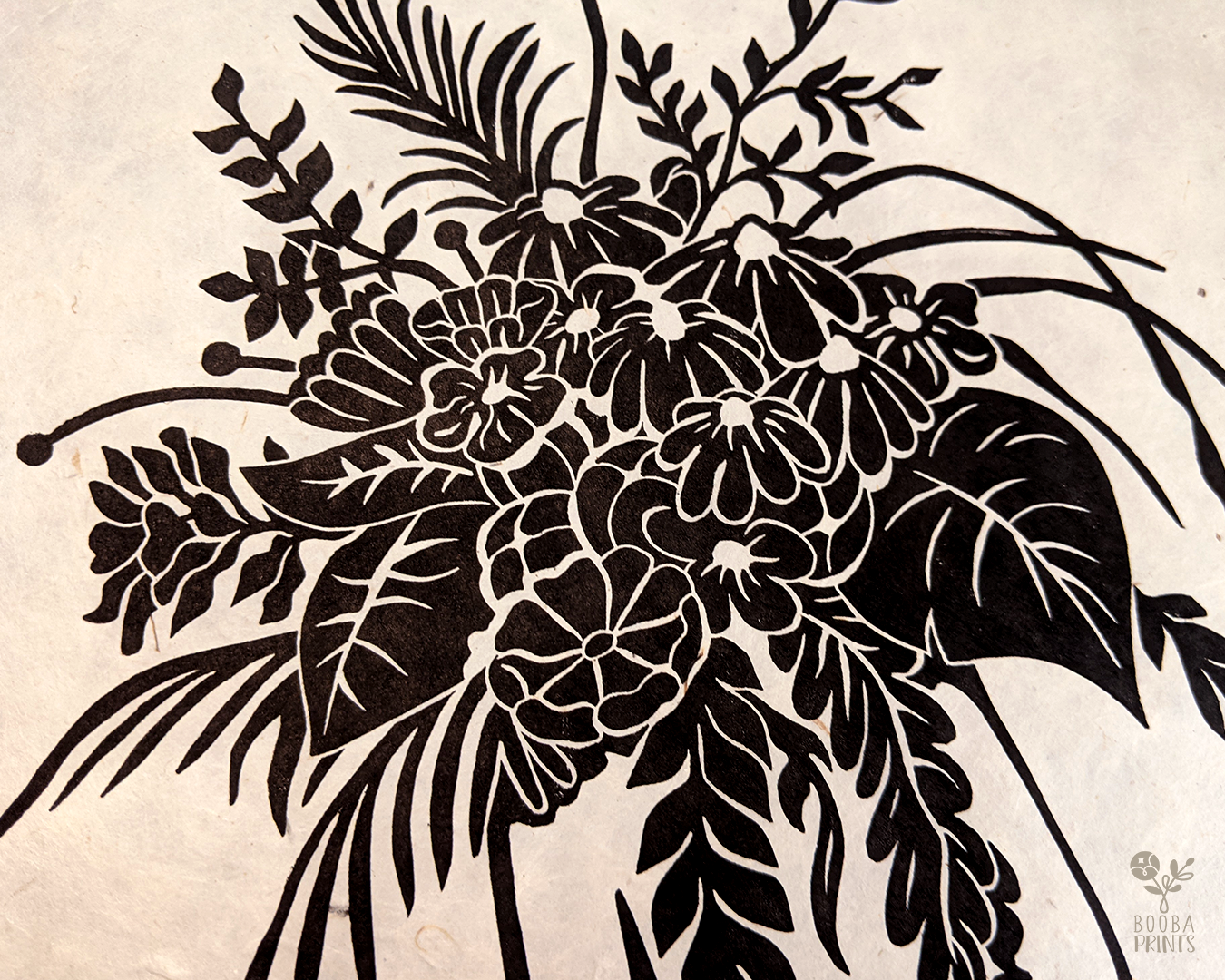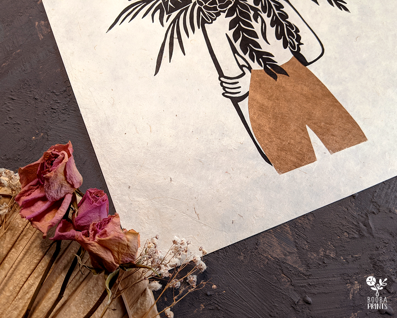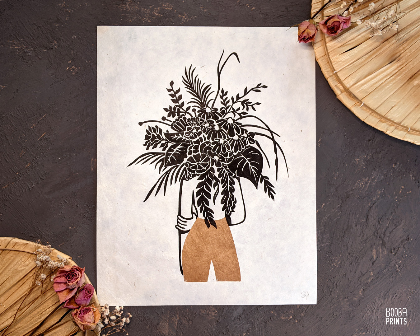 This is my "Flower Head Girl", a handmade linocut print which was born out of my love for flowers, and flowers arrangements
