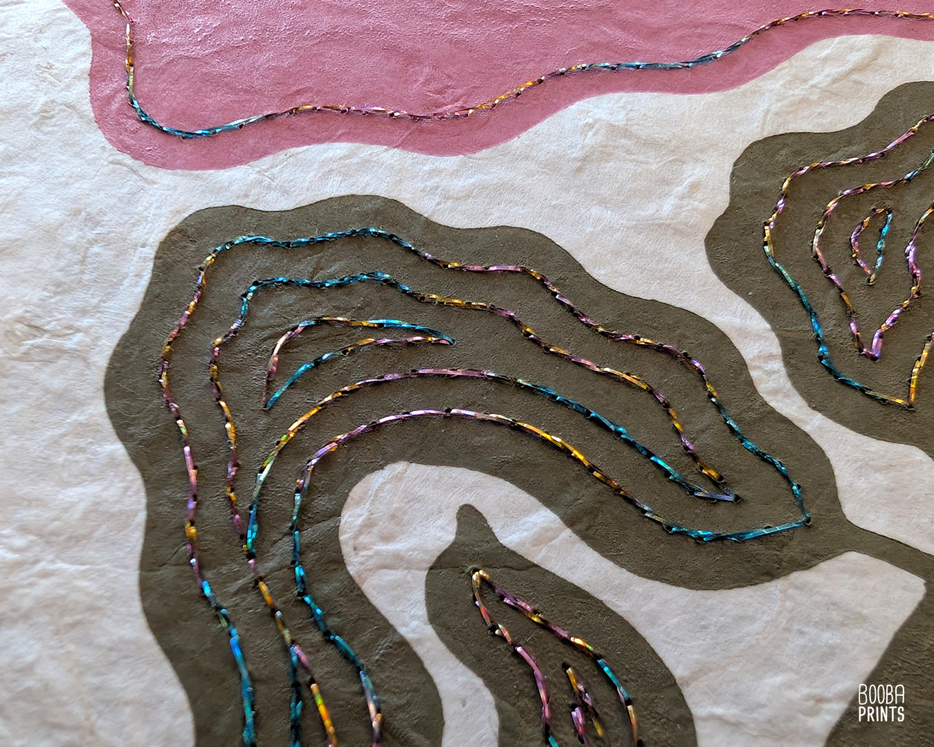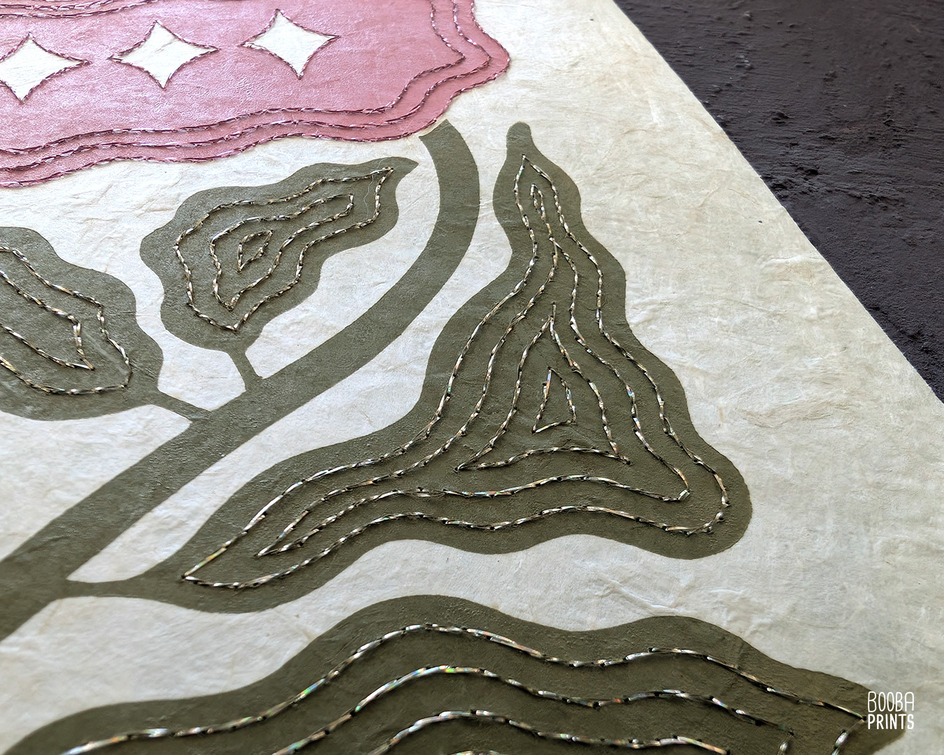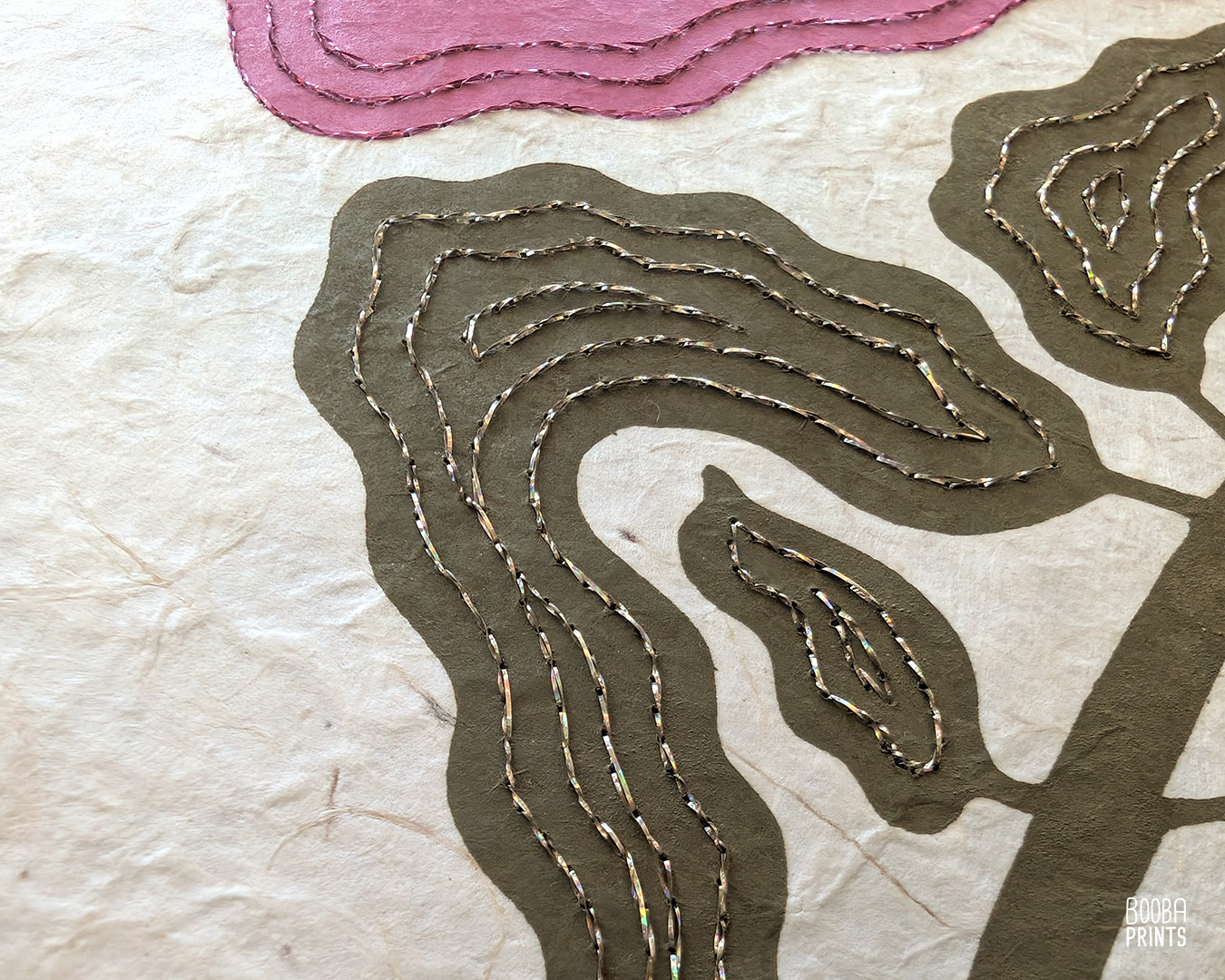 Flower Spark is a minimalist stylized linocut print of a flower in pink and green, and hand embroidered on top with shimmery thread. I enjoy creating such a contrast between the modern stylized design and the traditional technique of printmaking.
