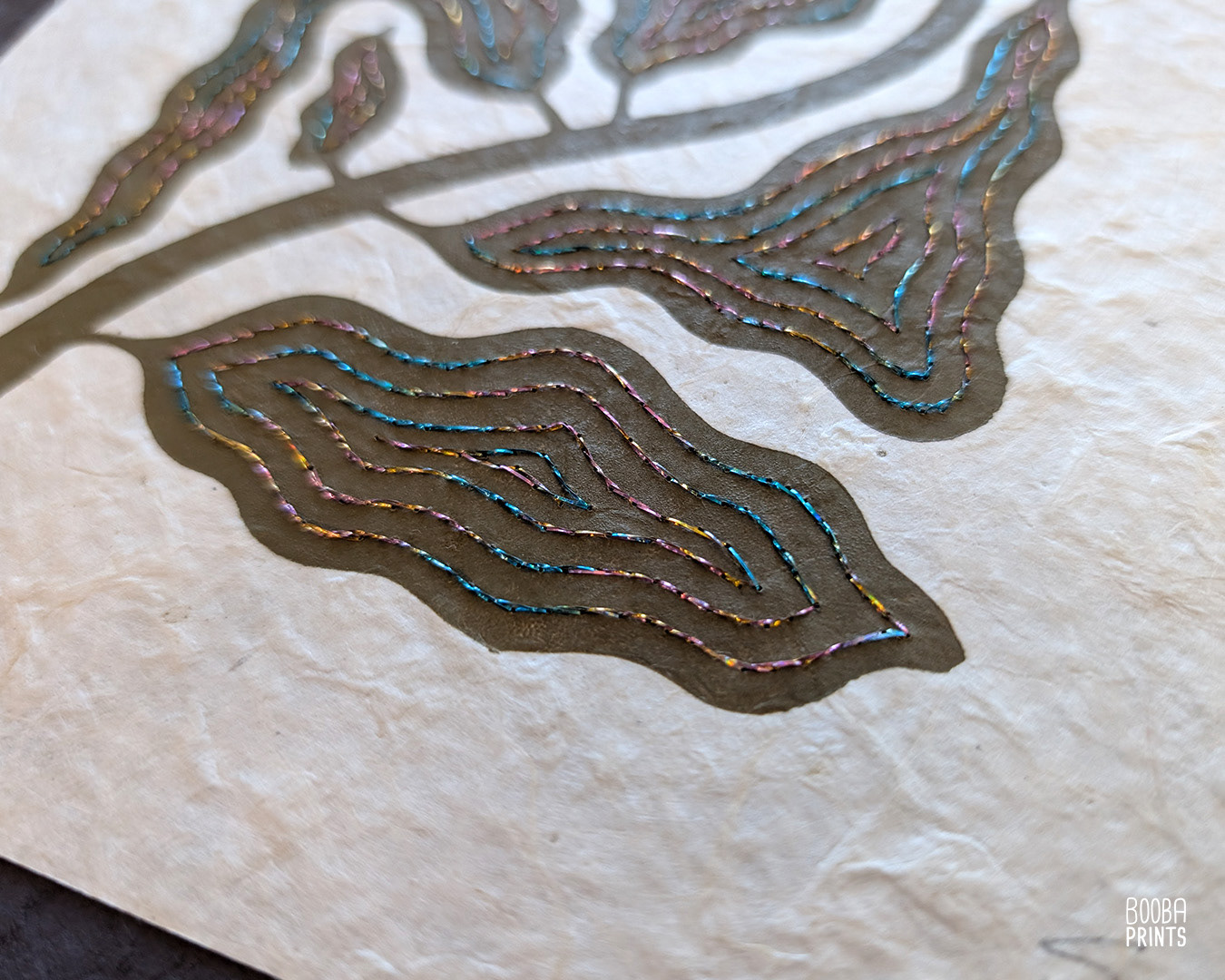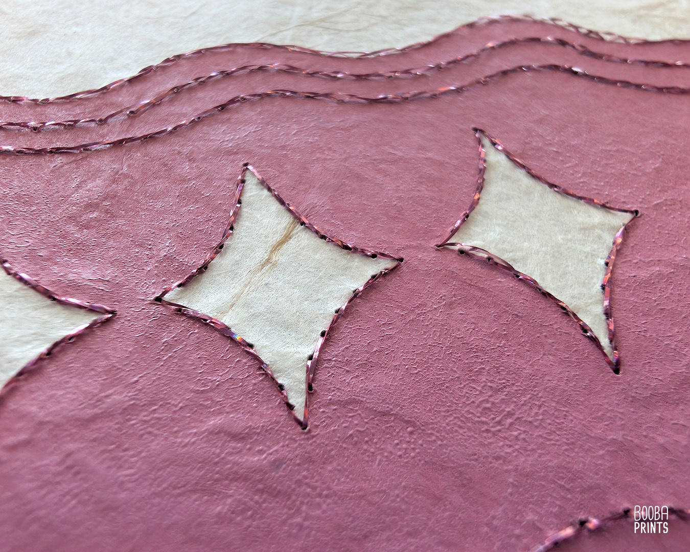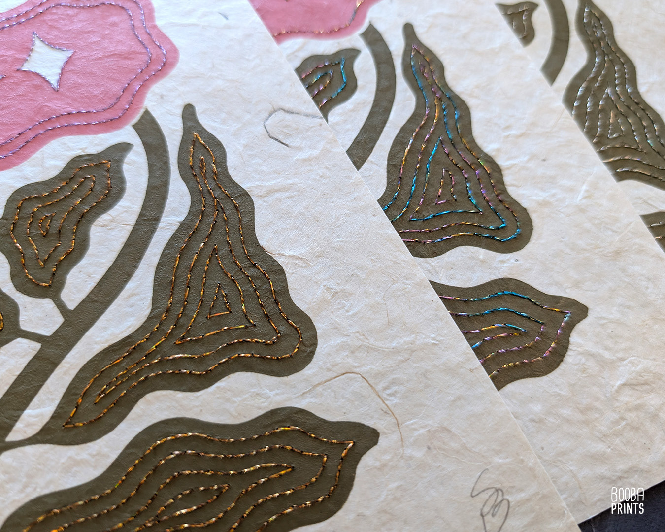 Flower Spark is a minimalist stylized linocut print of a flower in pink and green, and hand embroidered on top with shimmery thread. I enjoy creating such a contrast between the modern stylized design and the traditional technique of printmaking.