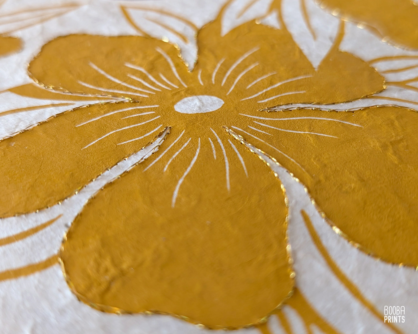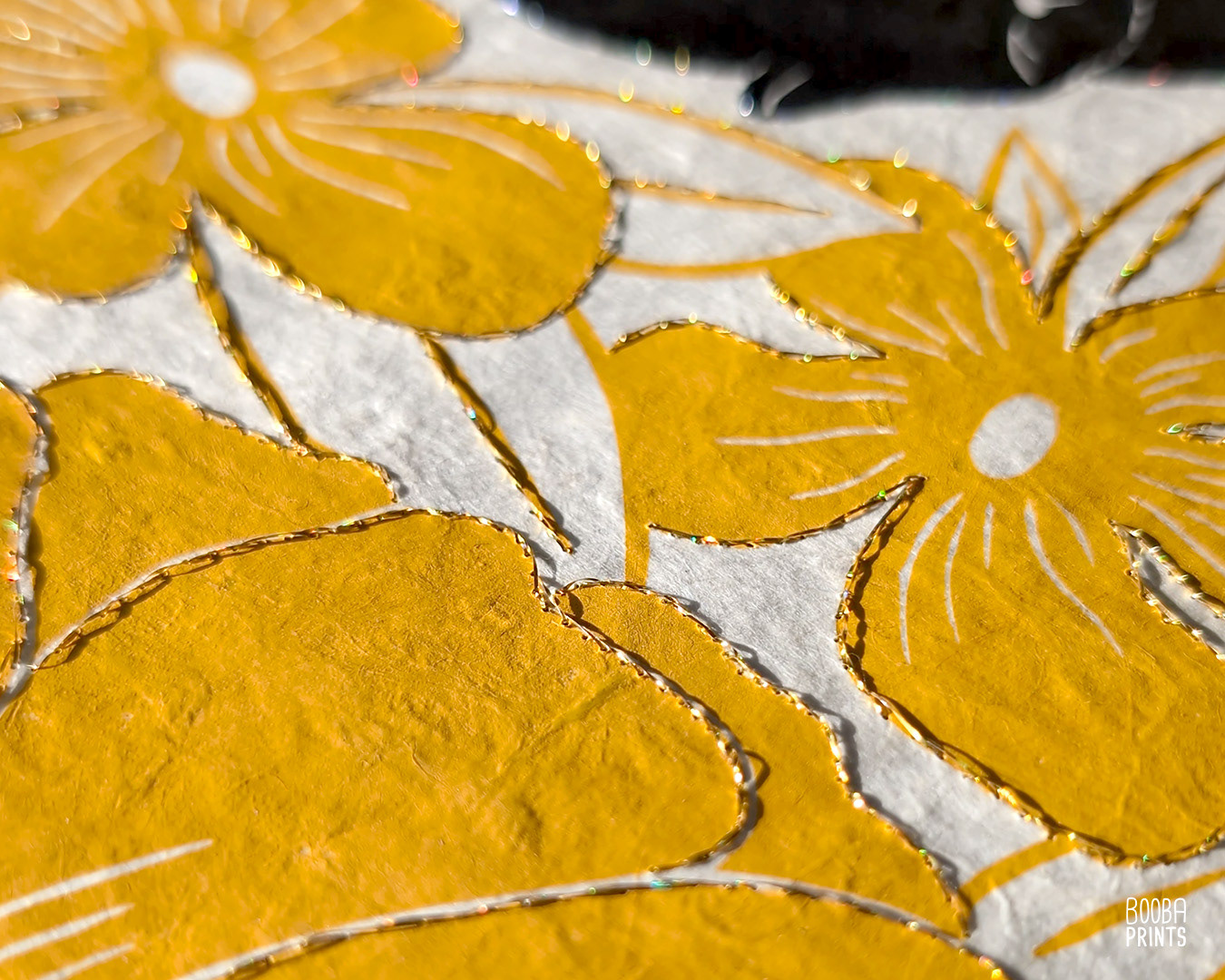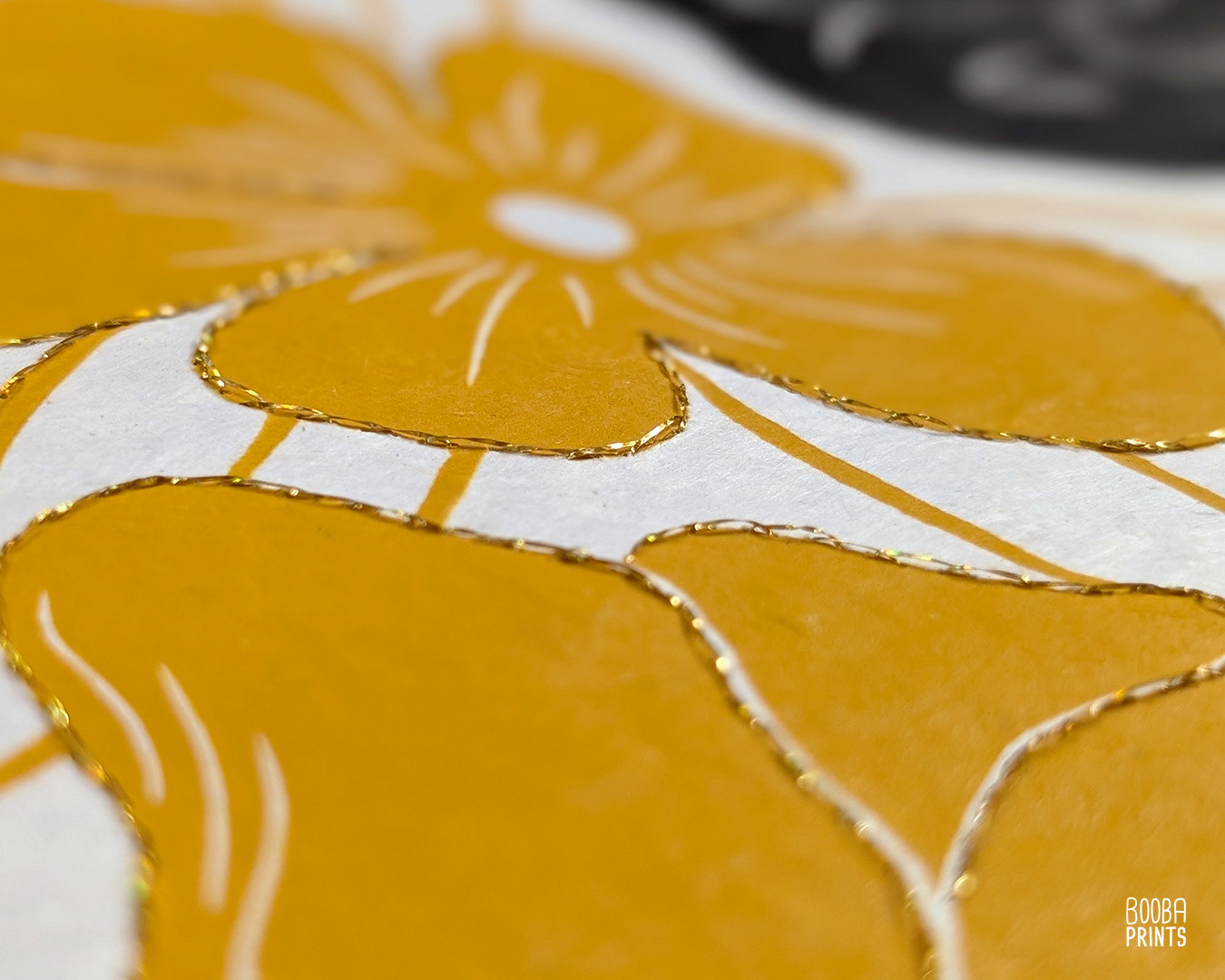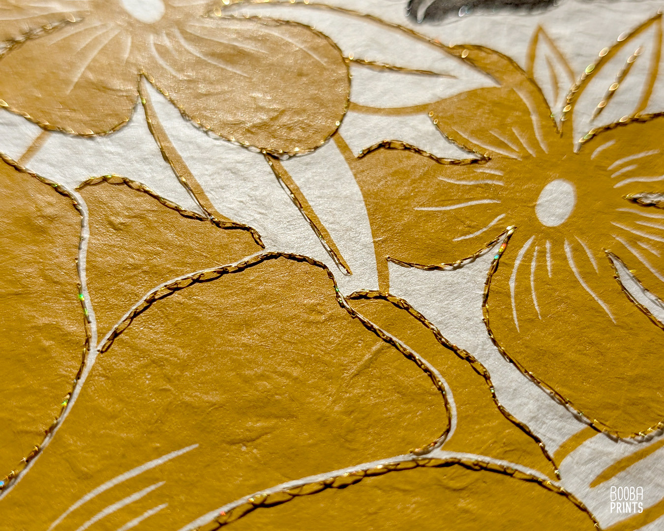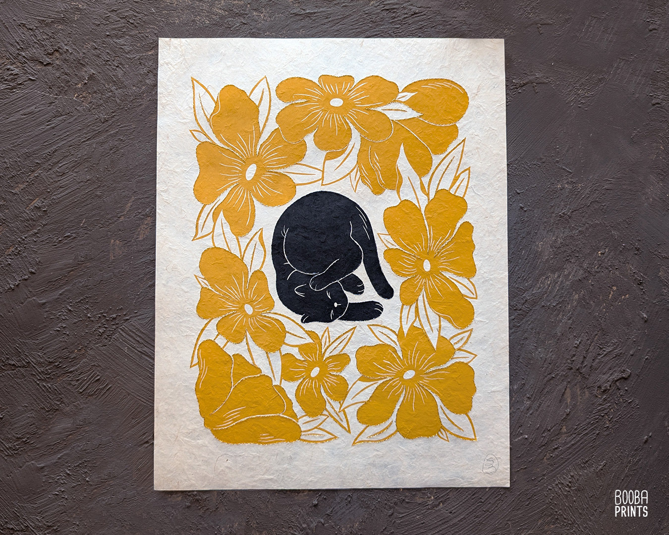 As part of my beloved print series "Cats and Plants", Lazy cat is a hand carved and hand printed linocut print. I created a hand embroidered version of this print, which was hand stitched with gold embroidery thread, giving the piece a tactile feel, and a beautiful airy contrast to the linocut print. Each print in the series in a different pose, and surrounded by different flowers. This series in done in the traditional technique of linocut printmaking