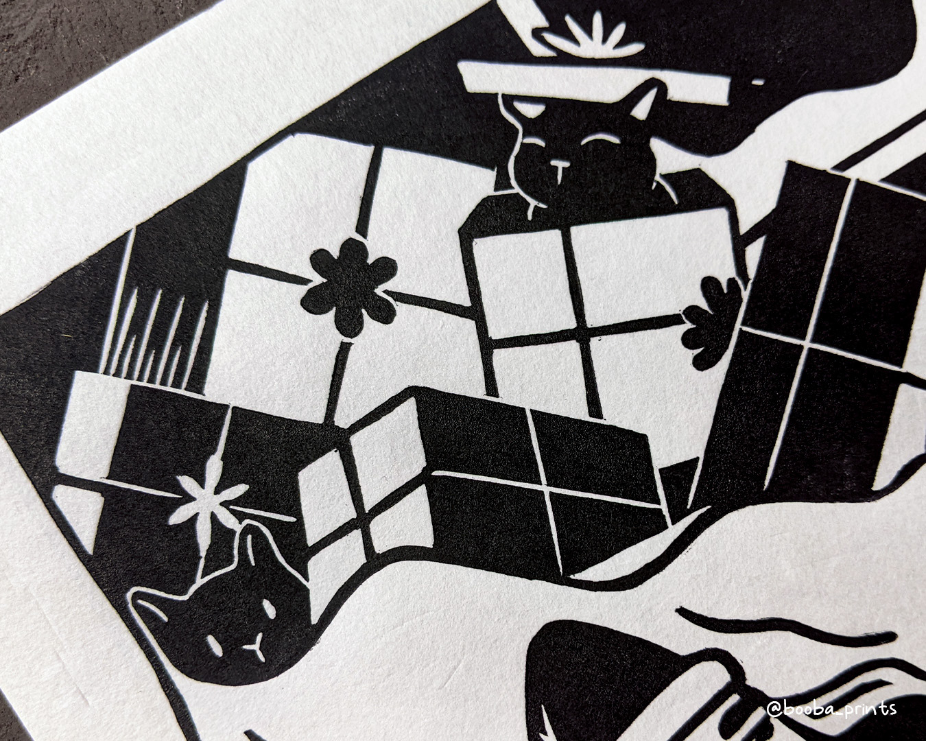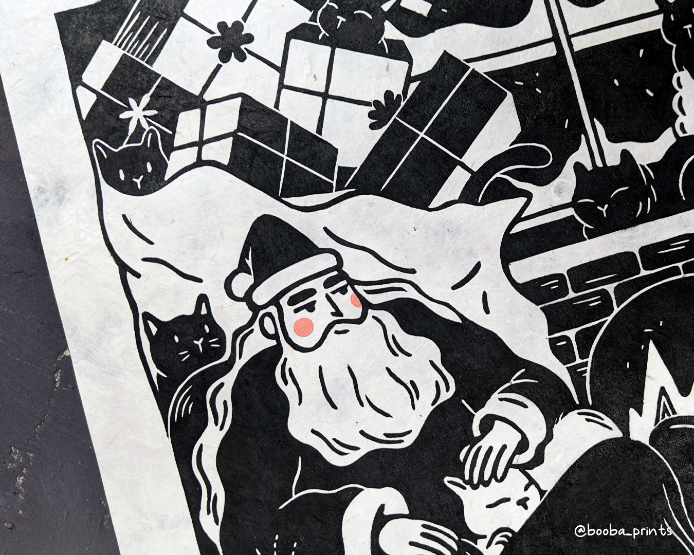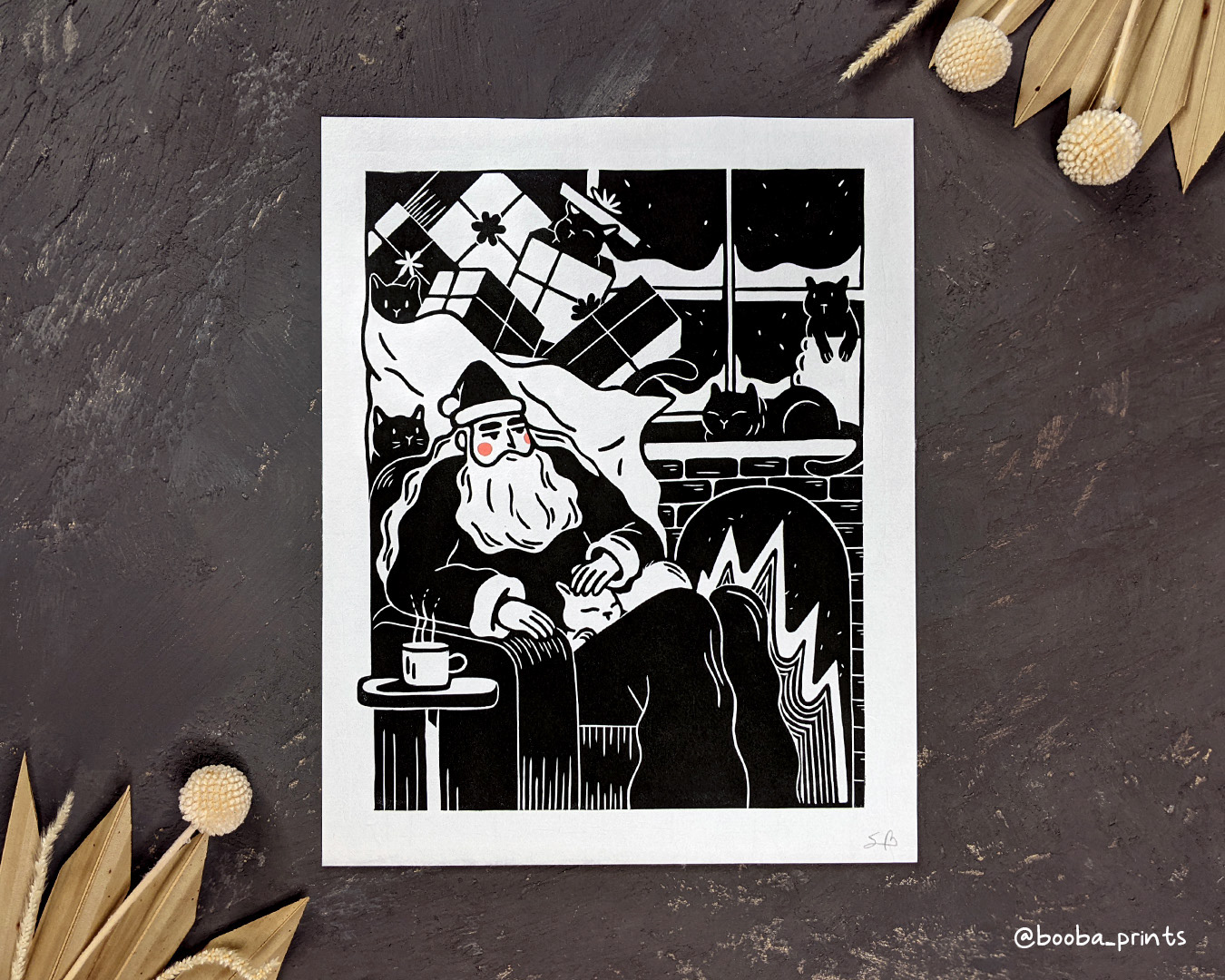 "Santa Is A Cat Person" is an illustration done in the technique of printmaking. Printed in the classic black and white looks, and finished by hand painting those rosy cheeks.
